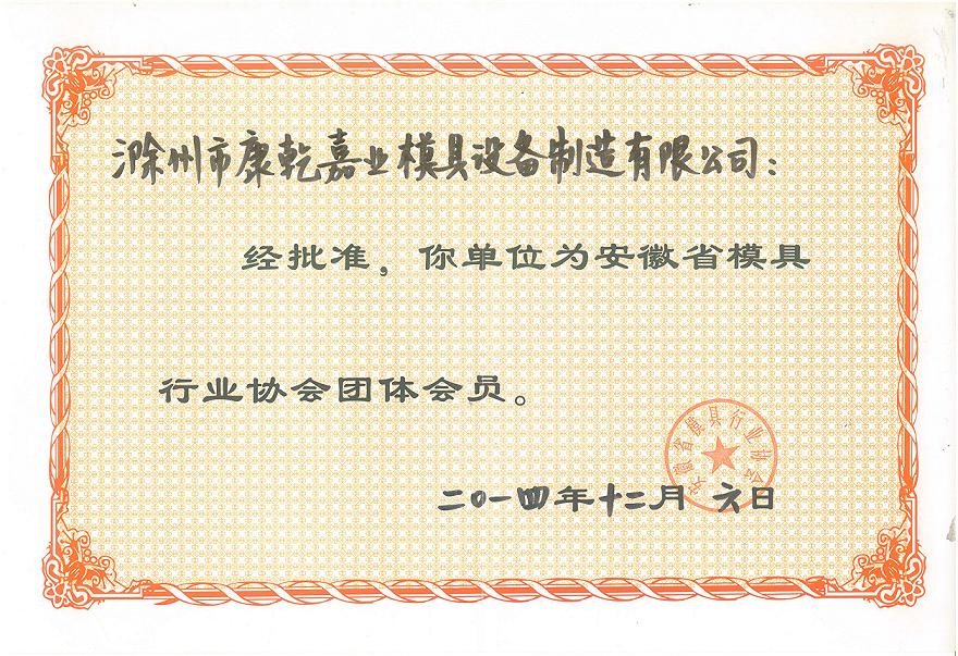 | 滁州市康乾嘉业模具设备制造有限公司加入安徽省模具协会 |